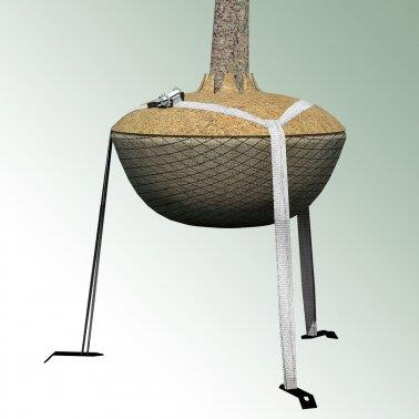- Ein Set enthält: 3 Erdanker mit Biogurtschlaufen, 1 Spanngurt mit Ratschunterteil und 1 Ballenschutzscheibe aus Kokos