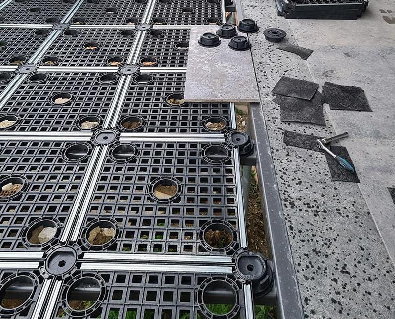 INSTALLATION: LEVEL UP ist ein patentiertes System von Dakota, das die Schaffung einer tragenden Struktur ermöglicht, die dank ihrer Stützen (mindestens 48 mm) in der Höhe verstellbar ist und auf der mehrformatige Fliesen für den Außenbereich verlegt werden können. Die Struktur besteht aus einem speziellen Material und wird durch Stahlprofile verstärkt. Die obere Ebene garantiert außerdem hohe Sicherheitsstandards im Falle eines Bruchs.