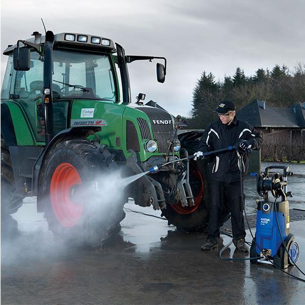 (160 bar / 620 l/h, 230 V) mit Schlauchtrommel und externem Schaumsprüh-Reinigungsmittelsystem.