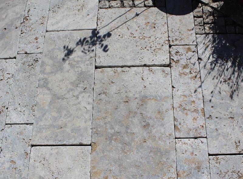 Pflasterplatten aus Muschelkalk, Stärke 3 cm, antik getrommelt,