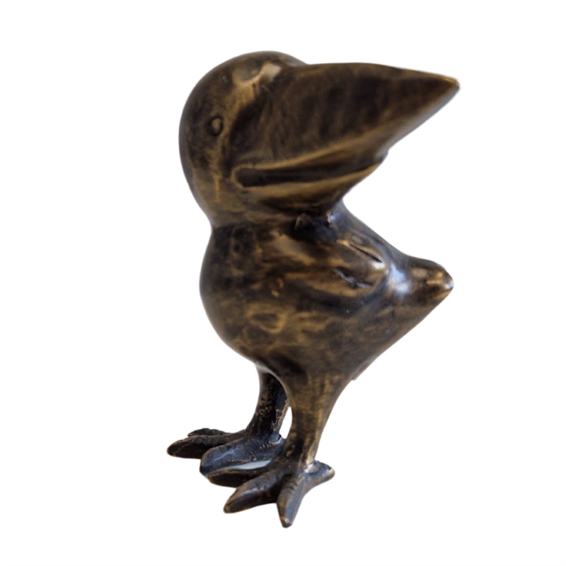 Diese detailreiche Bronzefigur eines kleinen Rabens besticht durch ihre exakte Darstellung und hochwertige Verarbeitung. Die brünierte Oberfläche verleiht der Figur eine edle Patina, die im Laufe der Zeit noch an Charakter gewinnt. Durch das aufwendige Gussverfahren können weiße Stellen durch das Auslösen aus der Form entstehen. Diese verschwinden jedoch durch die natürliche Patina, die Bronze im Laufe der Zeit anlegt. Bei Aufstellung im Außenbereich oxidieren die Bronzefiguren vollständig und entwickeln so eine einzigartige Optik.