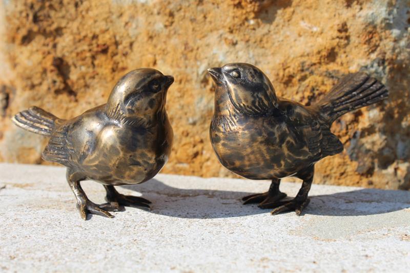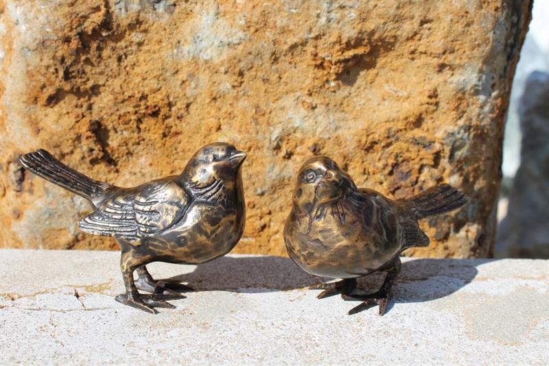 Dieses bezaubernde Vogelpärchen aus hochwertigem Bronzeguß besticht durch seine Detailtreue und elegante Verarbeitung. Mit einer brünierten Oberfläche versehen, erhalten die Figuren eine edle Patina, die im Laufe der Zeit noch an Charakter gewinnt. Die unterschiedlichen Größen und Längen der Vögel verleihen dem Set eine natürliche und harmonische Ausstrahlung. Durch das aufwendige Gussverfahren können weiße Stellen durch das Auslösen aus der Form entstehen, die jedoch durch die natürliche Patina verschwinden. Bei Aufstellung im Außenbereich oxidieren die Bronzefiguren vollständig und entwickeln so eine einzigartige Optik.
